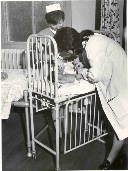 Nurse and doctor examining an infant, 1970 (catalogue reference: SBHF/PG/28)