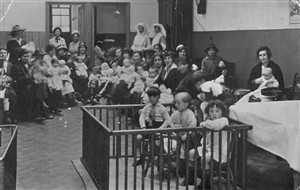 (Note: the photograph shows a mother-and-baby clinic in the Stepney area in 1917. The author's great-grandmother, Sonia Levinson, is seated third from the right in the front row, with her fourth child Freda on her knee. This would have been the kind of maternity and child welfare provision for the women of East London that Lady Barrett envisaged in her proposal of 1916.)