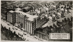 Architecturally, the Mothers’ Hospital was a mixture of styles. The frontage was not original but consisted of a gap-toothed row of early Victorian houses, behind which a 2.75-acre site was used to develop a series of six bungalow wards and an isolation block. The six ‘cottage’ blocks, as they were also called, were connected by a colonnade to the entrance building. Trees, shrubs and flowers were planted between the buildings, and at the far end was an ornamental garden. Ground floor plans of a typical bungalow ward show a six-bed ward, a four-bed ward and a two-bed ward serviced by a ward kitchen, toilets and bathrooms, in addition to the labour room.